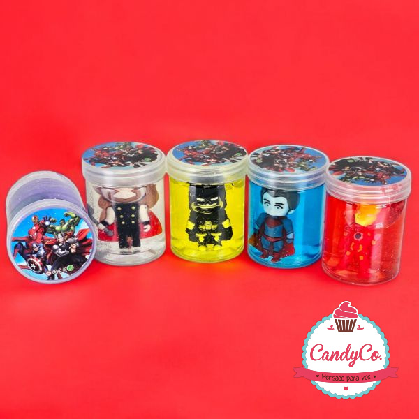 Slime en Pote Cilíndrico con Muñeco de Silicona Súper Héroe
