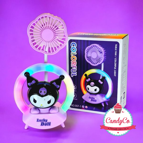 Lámpara Led, Velador Círculo Multicolor con Cabeza de Kuromi Lucky Doll y Ventilador Recargable Usb