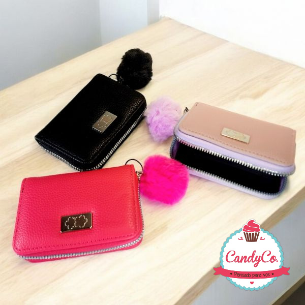 Billetera Tarjetero con Diseño Texturado y Detalle Plateado con Flor y Pompón