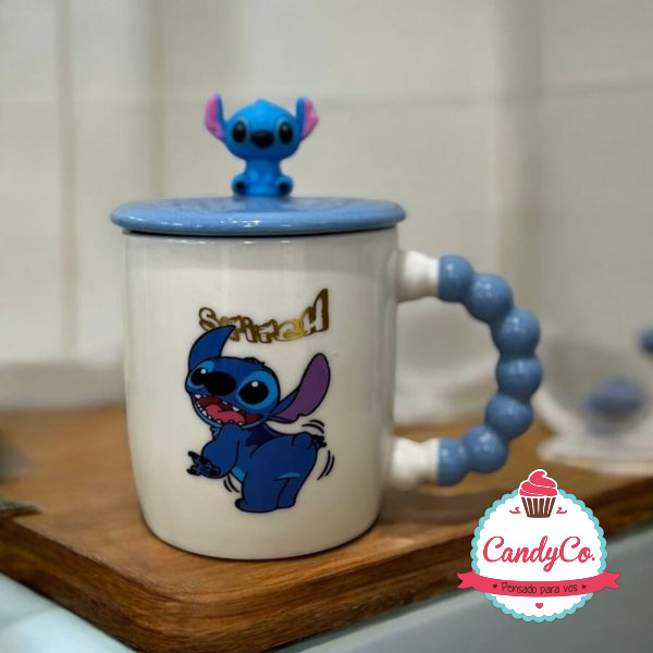 Taza de Ceramica Estampada de Stitch con Cuchara y Tapa con Muñeco de Silicona