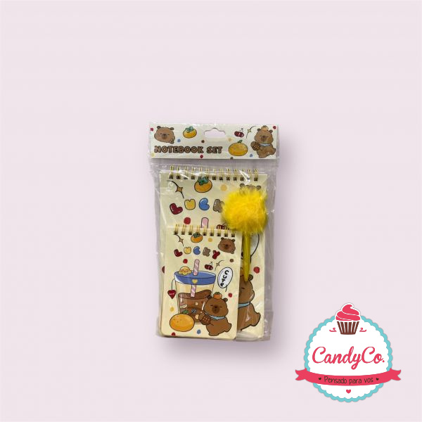 Set de Libretas Anilladas Estampadas Chica y Grande Diseño de Carpincho, Capybara, Capibara, Huella, Pata de Gato X2 y Mini Lapicera con Pompón