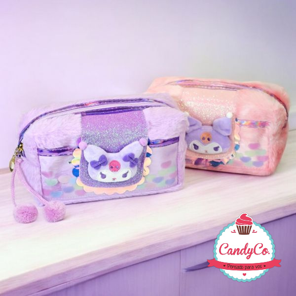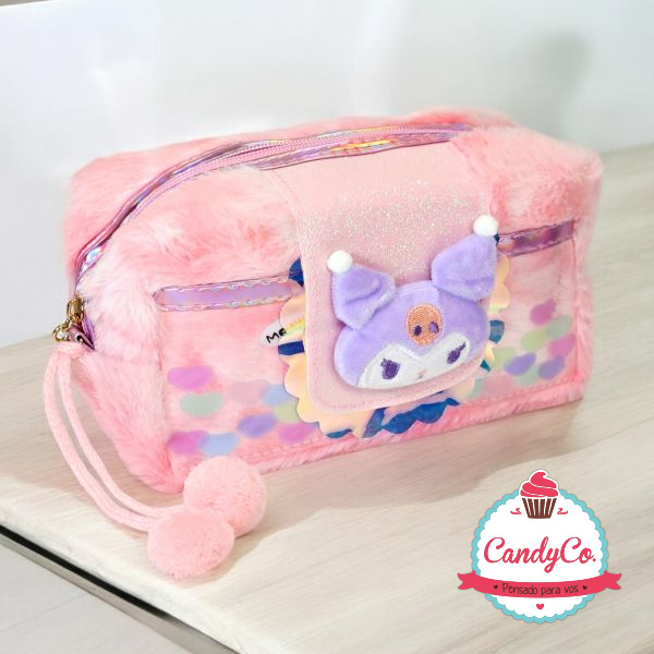 Portacosméticos de Peluche con Diseño de Kuromi con Detalles Tornasolados y Pompones