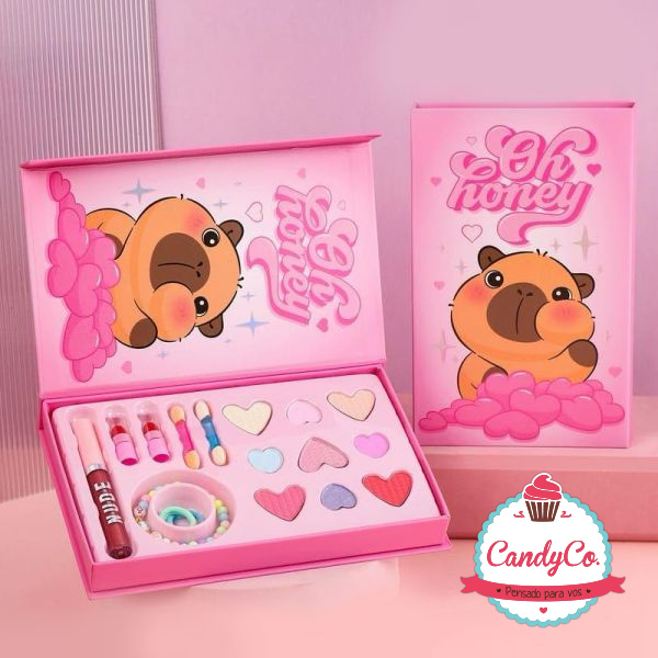 Set de Maquillaje con Sombra para Ojos X9, Lápiz Labial, Brillo Labial, Aplicadores, Colitas para el Pelo, y Pulsera en Caja Carpincho, Capybara, Capibara Oh Honey