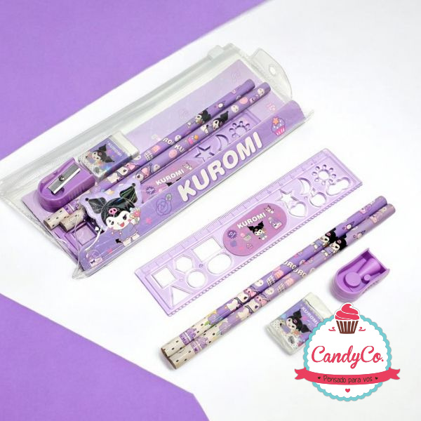 Set de Útiles Escolares con Lapices Negros X2, Goma de Borrar, Sacapuntas, y Regla en Estuche con Diseño de Kuromi