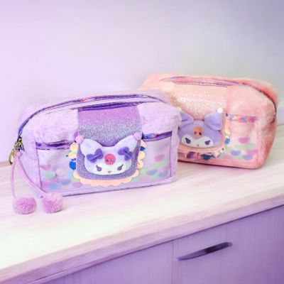 Portacosméticos de Peluche con Diseño de Kuromi con Detalles Tornasolados y Pompones